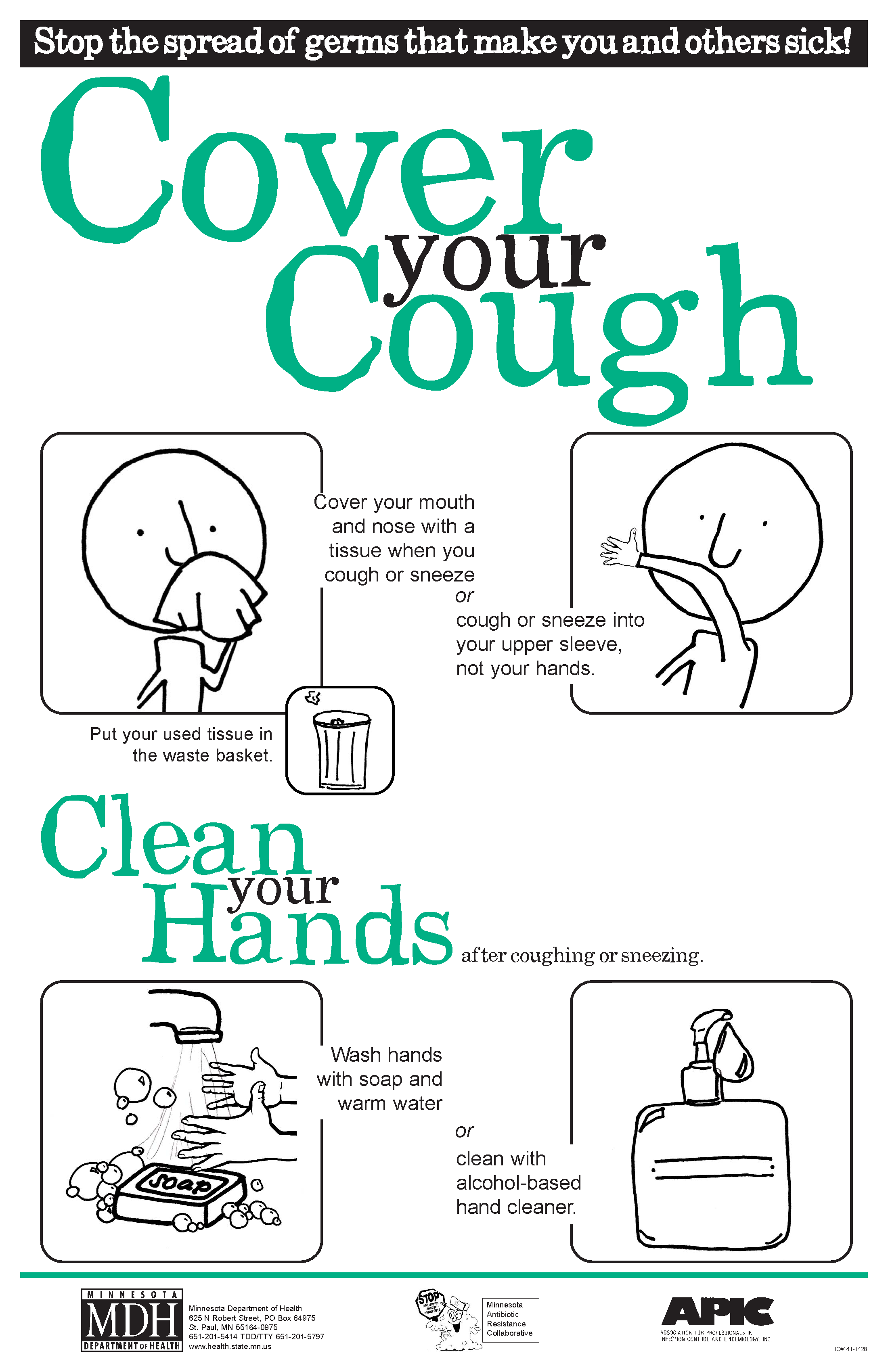 The "green" cover your cough poster for the community asking people to cover their cough and clean their hands. This poster is available for download in several languages.